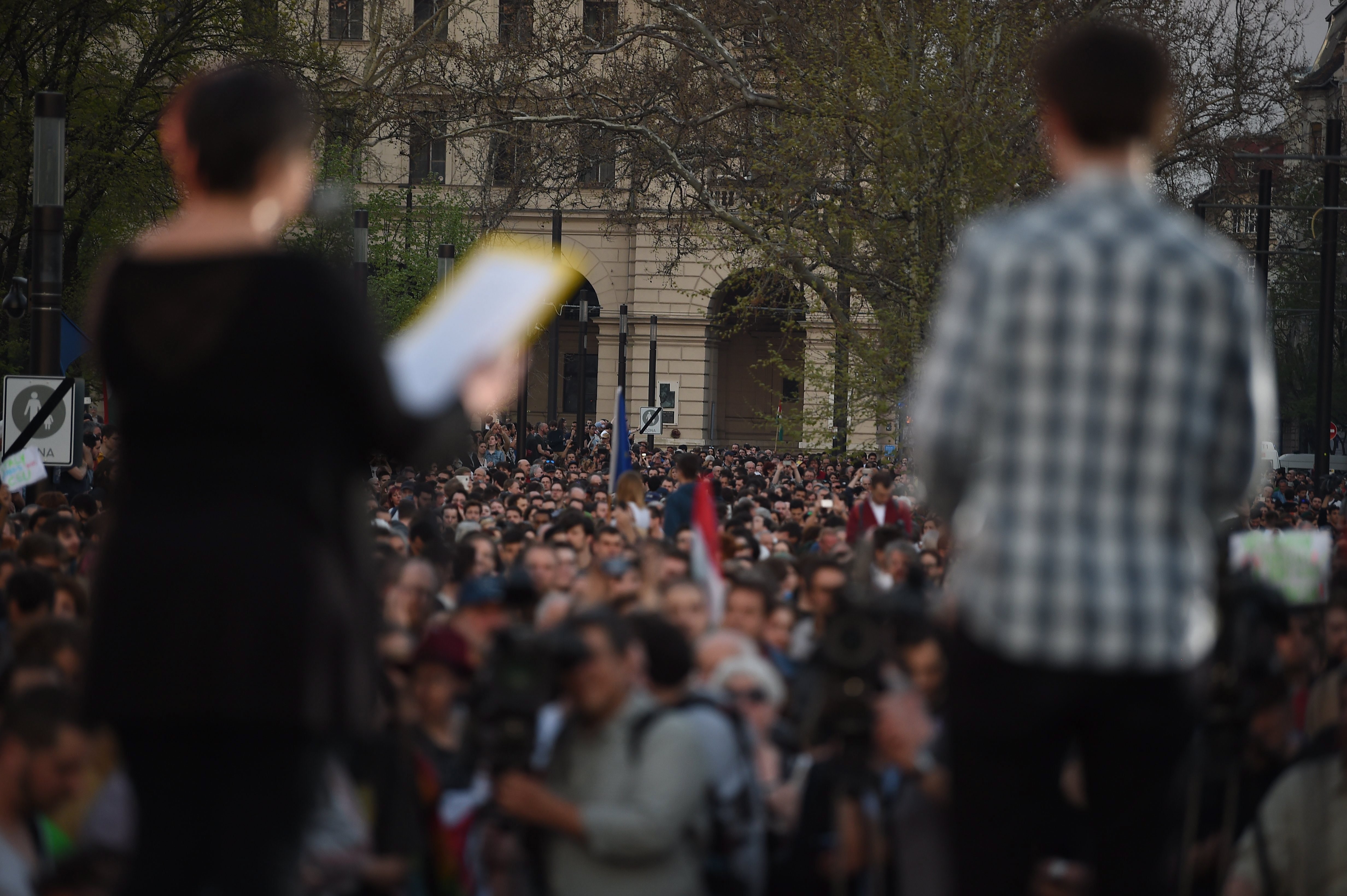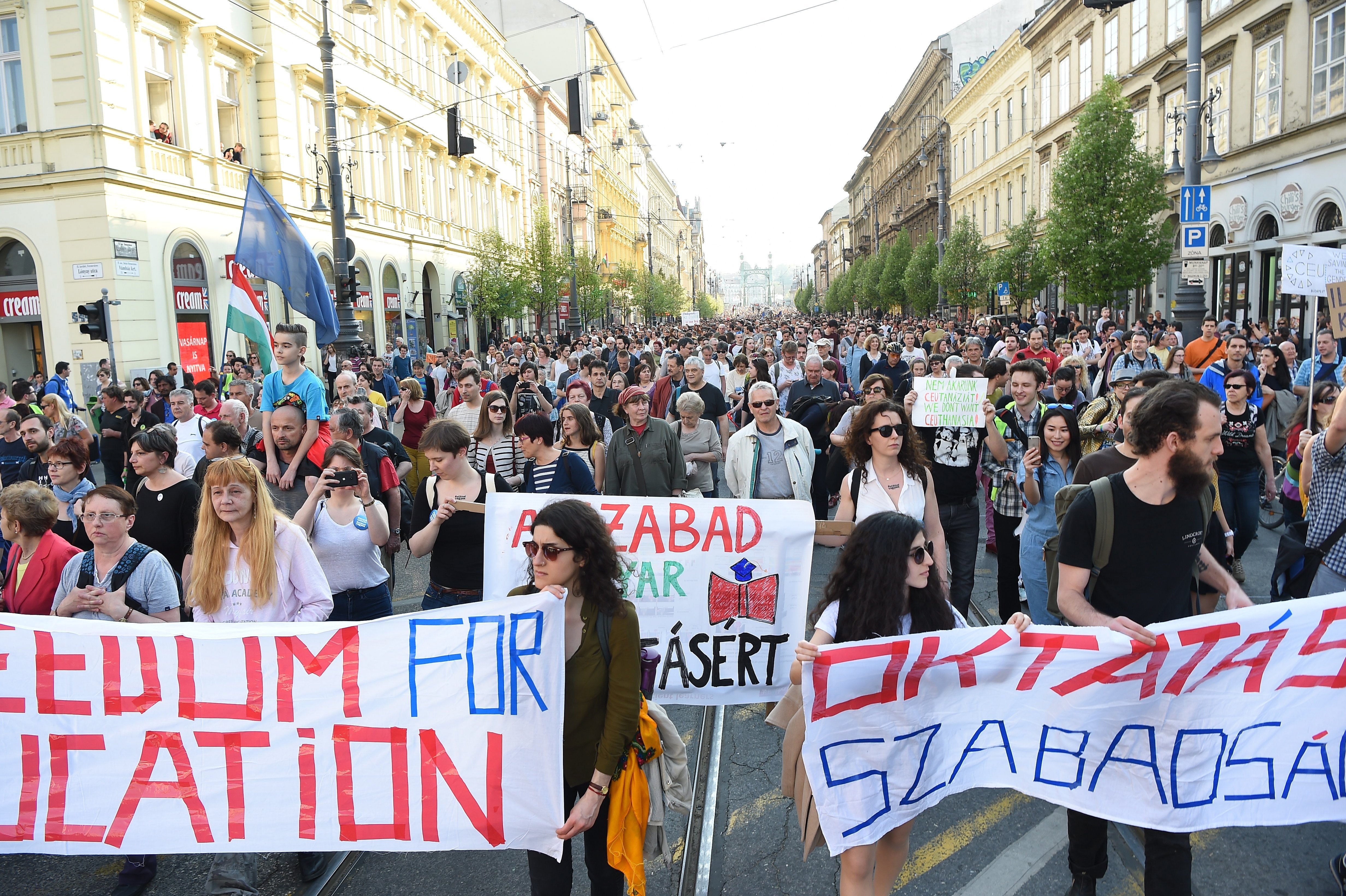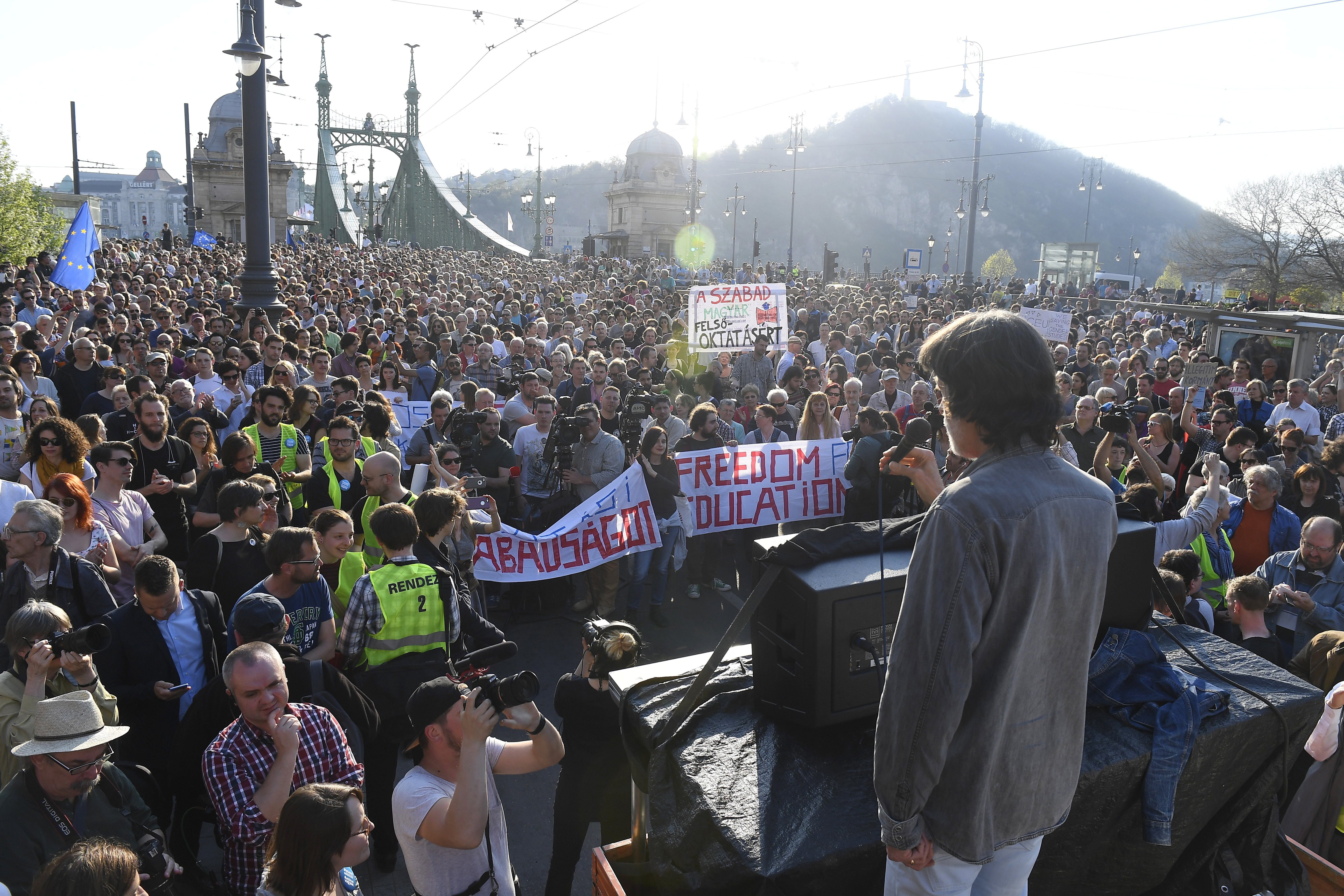 A szervezők becslése szerint mintegy tízezres tömeg, valamint civil és oktatási szervezetek képviselői a felsőoktatási törvény tervezett kormányzati módosítása ellen tiltakoztak, és a CEU-val fejezték ki szolidaritásukat. Békés Gáspár, a Független Diákparlament képviselője a CEU épülete előtt arról beszélt: szerinte a tervezett jogszabály-módosítás valójában elszánt támadás az egyik legkiválóbb magyar egyetem ellen.